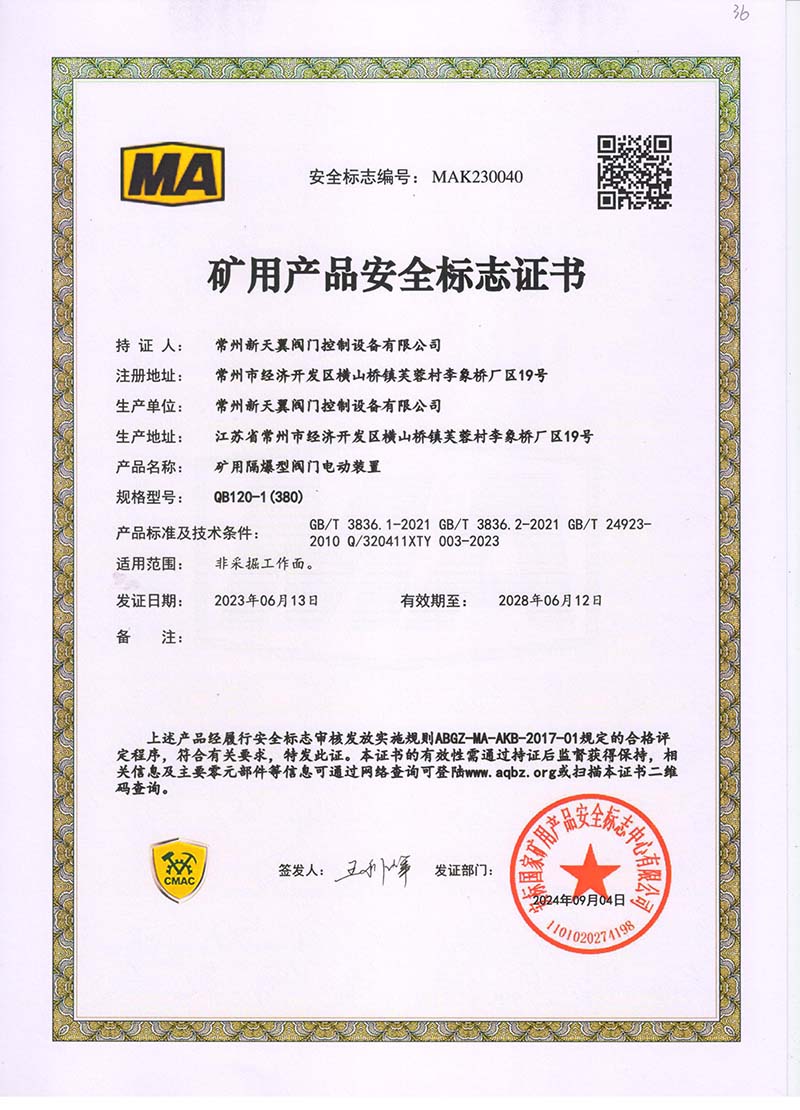 礦用隔爆ZB10-24中國國家強制性產品認證證書110.2